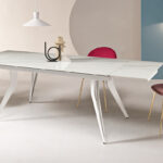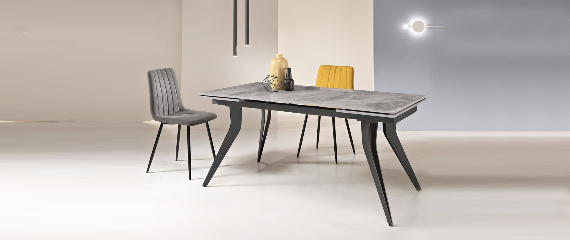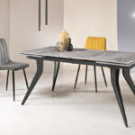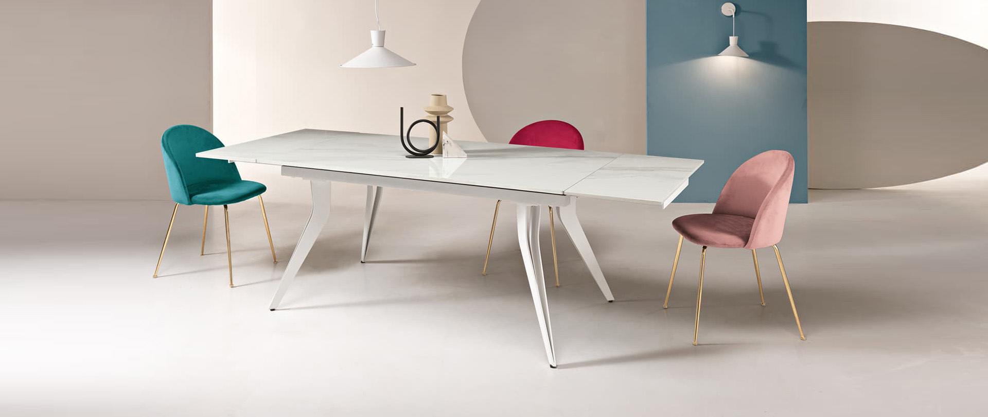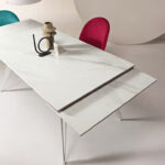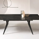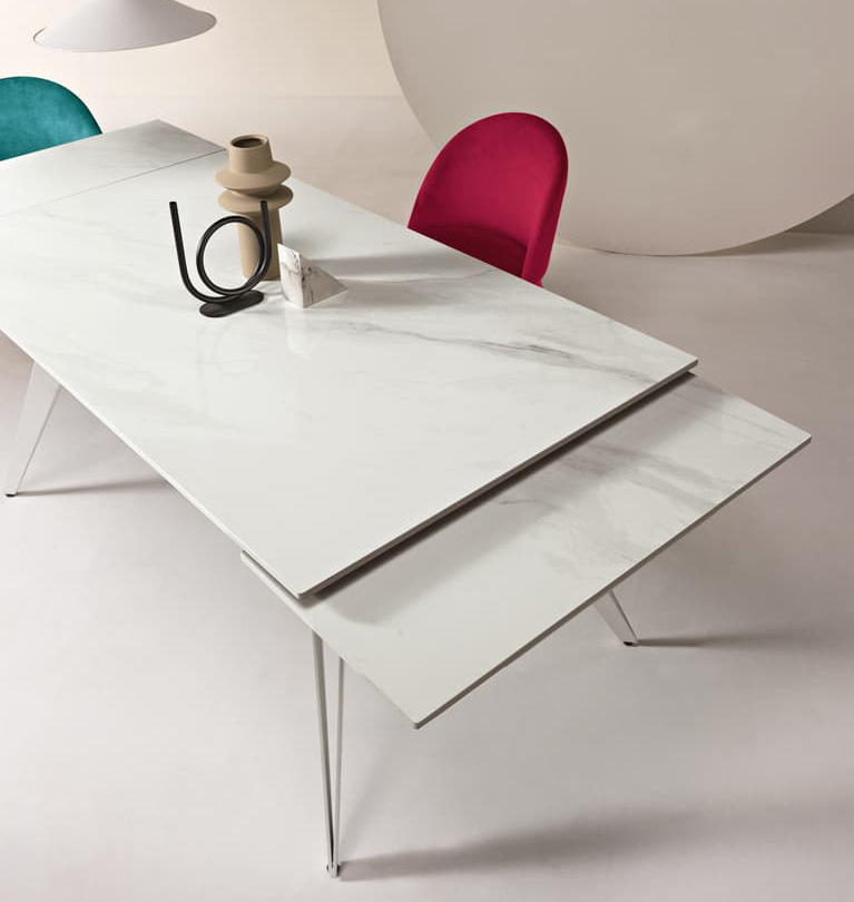 Tavolo allungabile con due allunghe da 40 cm; base in metallo verniciato e piano in pietra sinterizzata effetto marmo.